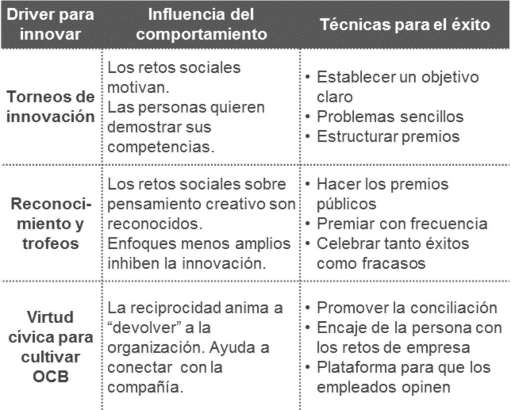 - Del mismo artículo Nothing for money… Drivers para innovar: concursos, reconocimientos, desarrollar la conducta de ciudadanía organizativa (como el compromiso genera participación).
