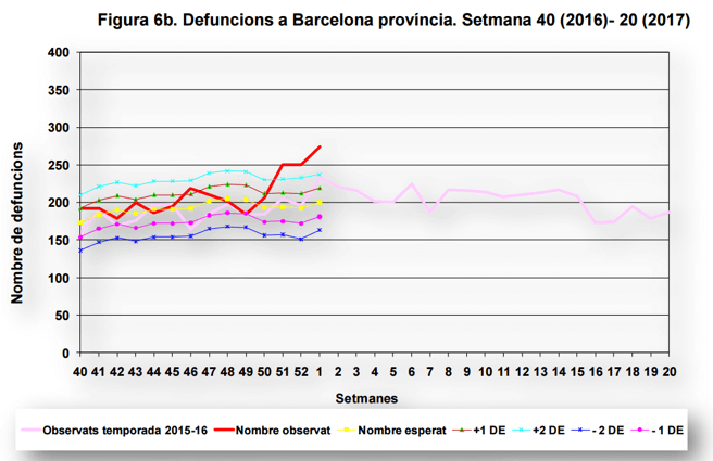 Las muertes por gripe en Barcelona superan todas las previsiones, La Vanguardia (Enero 2017). En la primera semana del año (2017) se han registrado más de 250 defunciones relacionadas con la epidemia, cifra que supera las dos desviaciones estándar respecto del valor esperado. Así lo recoge el informe de la Generalitat
