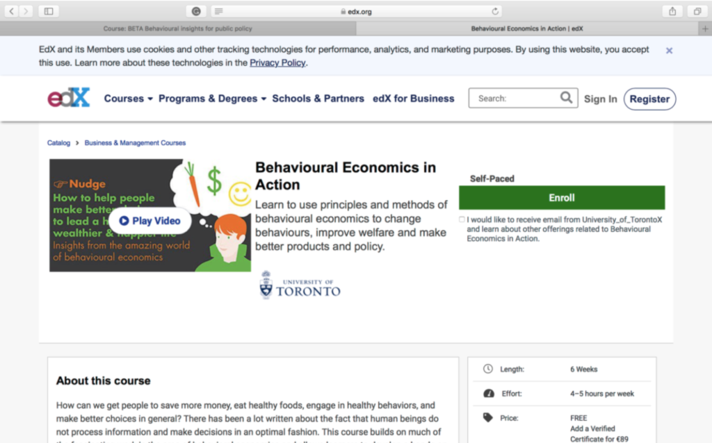 The first, Behavioural Economics in Action edX. This course builds on much of the fascinating work in the area of behavioral economics and allows learners to develop a hands-on approach by understanding its methods and more importantly, how it can be harnessed by suitably designing contexts to “nudge” choice.