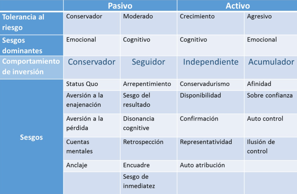 El mismo autor del artículo Michael Pompian, en su libro Behavioral Finance and Wealth Management: How to Build Optimal Portfolios That Account for Investor Biases, describe los sesgos de nuestro comportamiento asociados a cada tipo de comportamiento inversor.